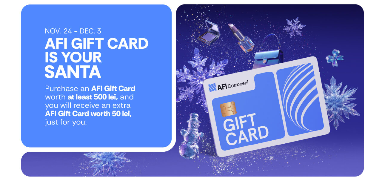 Între 24 noiembrie și 3 decembrie, când cumperi un AFI GIFT Card de minimum 500 lei, primești încă un AFI GIFT Card CADOU, în valoare de 50 lei, doar pentru tine.