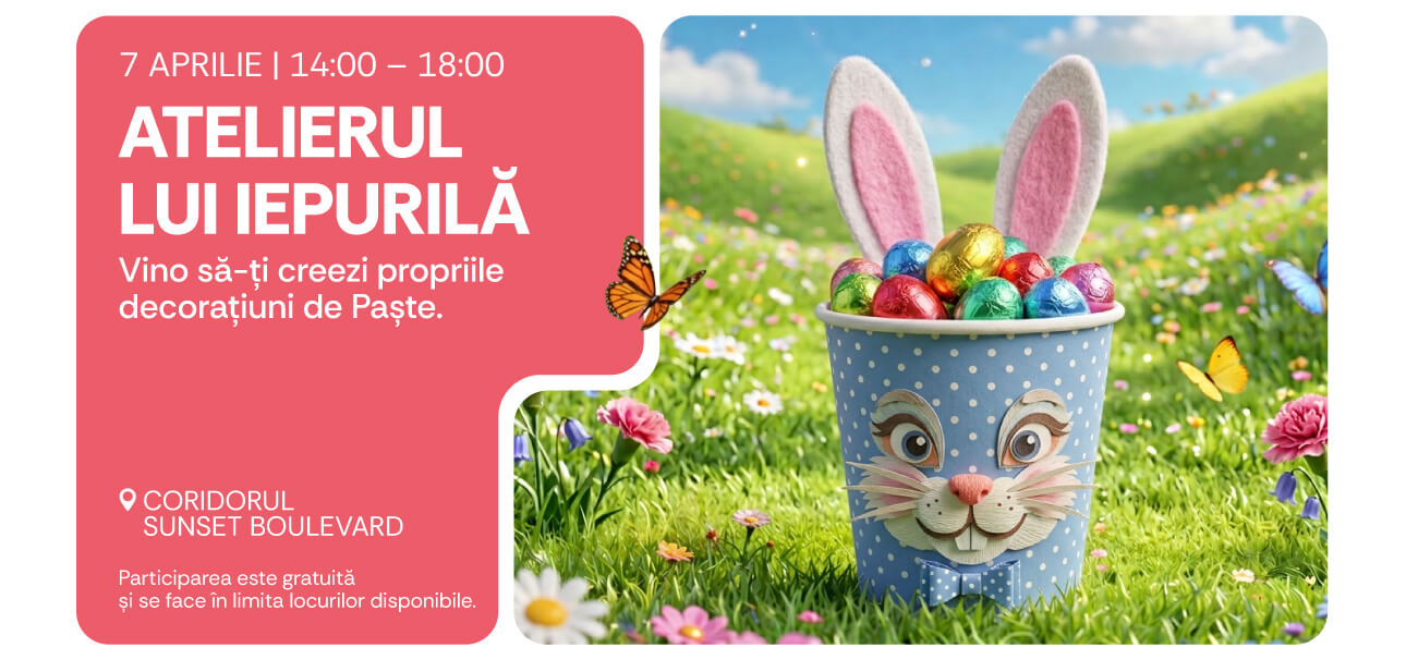 Te așteptăm la Atelierul lui Iepurilă, pe 7 aprilie, între 14:00–18:00, pe coridorul Sunset Boulevard, unde cei mici dau viață celor mai haioase decorațiuni de Paște.