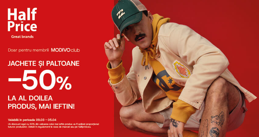 HalfPrice: pentru membrii MODIVOclub: -50% la al doilea produs din categoria jachete si paltoane.